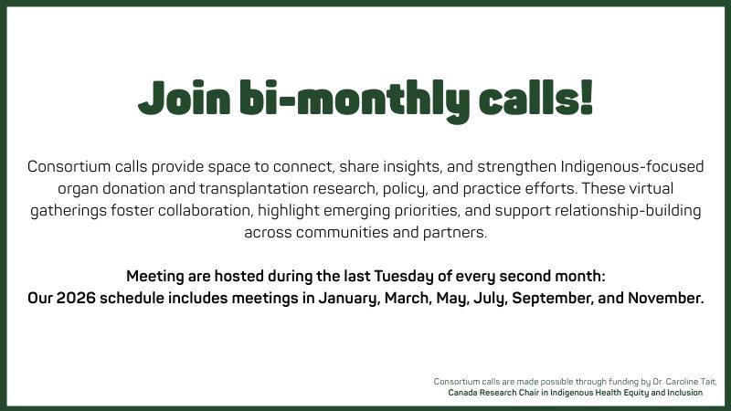 The Consortium was created in response to persistent inequities in access to organ donation and transplantation medical services experienced by Indigenous communities. Guided by principles of Indigenous self-determination, data sovereignty, cultural safety, and relational accountability, the Consortium members work to identifying community priorities, shape research, and advancing solutions grounded in community knowledge and lived experience.