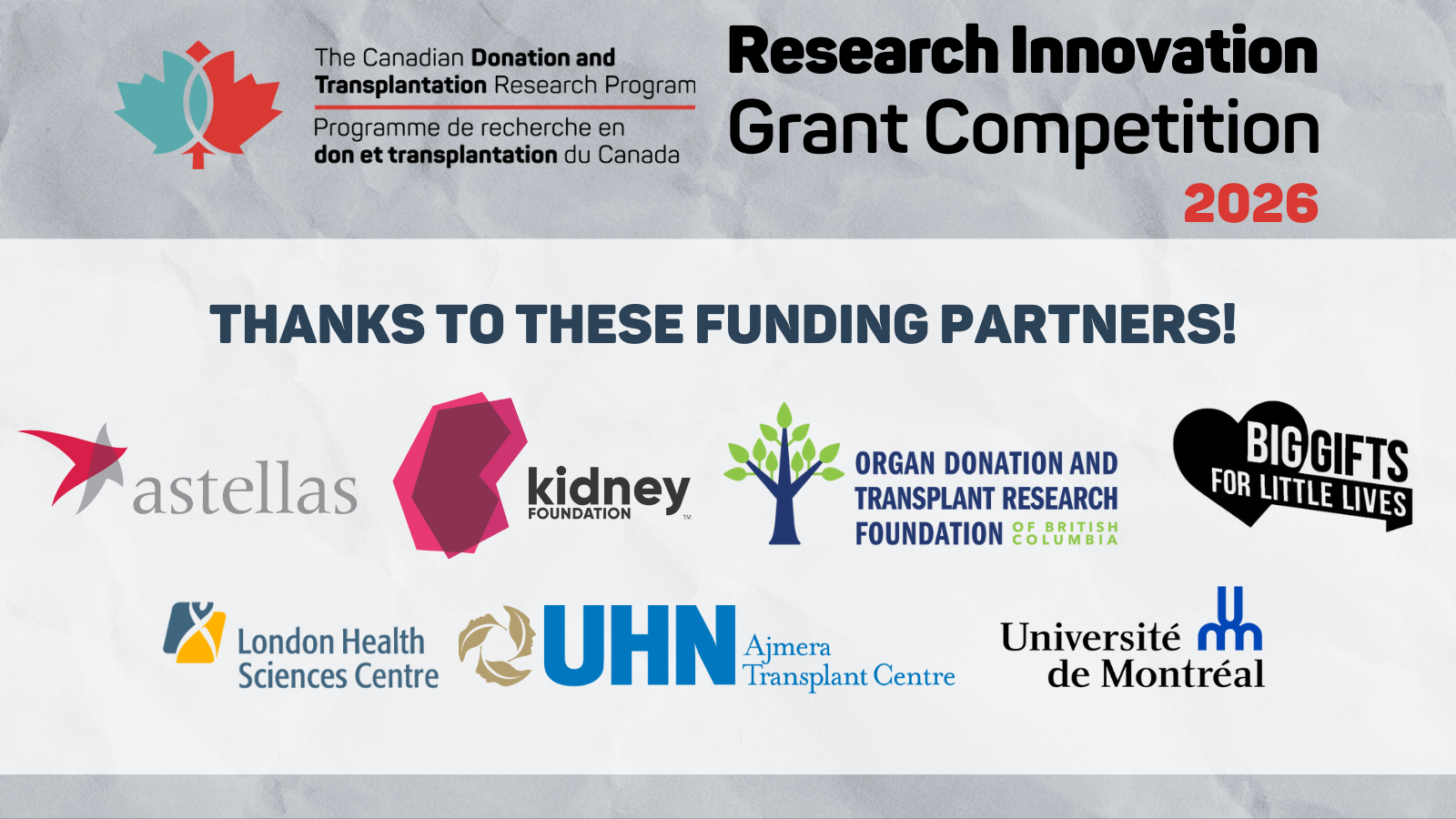 Through strategic partnerships with several key partners across Canada, the CDTRP has sustained a commitment to research and development within the transplant scientific community through the continued launch of the CDTRP Research Innovation Grant Competitions. This collaborative effort between the CDTRP and our partners is intended to seed new and innovative pilot projects in the transplant and donation field.