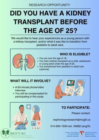 Patient engagement opportunity - Young adult kidney transplant recipients Researchers at McGill University are conducting a study to hear your experiences as a young person with a kidney transplant, and/or what it was like [...]