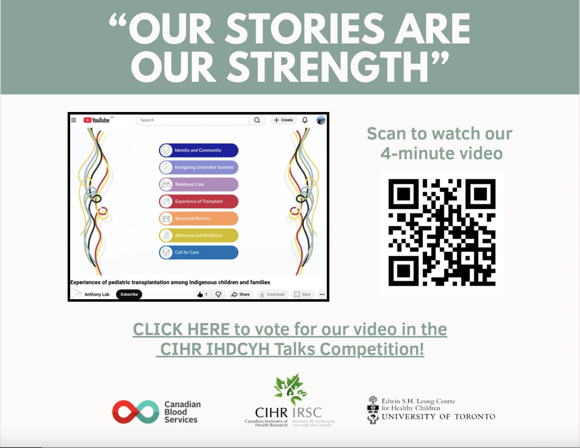 Their video, “Our stories are our strength”: Experiences of pediatric transplantation among Indigenous children and families, highlights our participatory research program to advance health equity in pediatric transplantation.
