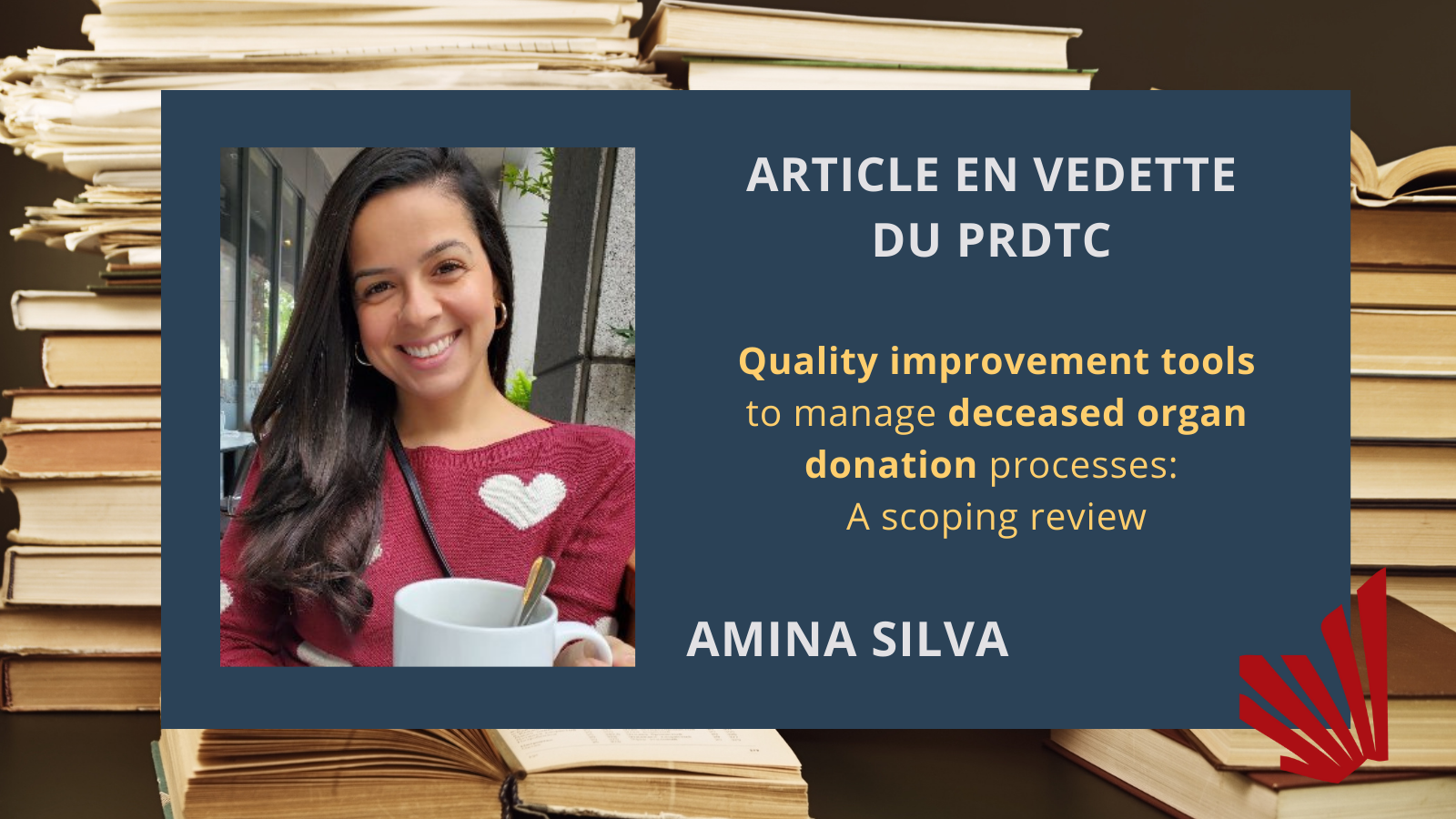 Le PRDTC tient à féliciter Amina Silva, infirmière et candidate au doctorat à l’Université Queen’s, pour sa récente publication intitulée : Quality improvement tools to manage deceased organ donation processes : a scoping review dans BMJ Open ! Amina est également stagiaire du PRDTC depuis plusieurs années et travaille en étroite collaboration avec la Dre Vanessa Silva e Silva, professeure adjointe à l’Université Brock.