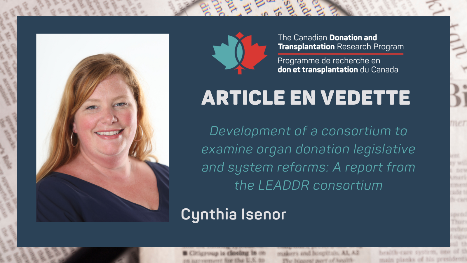 Le Programme de recherche en don et transplantation du Canada (PRDTC) est fier de féliciter Cynthia Isenor et son équipe pour son récent article dans le Journal du Collège canadien des leaders en santé, intitulé : Development of a consortium to examine organ donation legislative and system reforms: A report from the LEADDR consortium. L’article fait la lumière sur le consortium Legislation Evaluation : Assessment of Deceased Donation Reform (LEADDR) qui vise à examiner diverses réformes législatives et systémiques pour le don d’organes. En tant que membre du PRDTC et défenseuse du don d’organes, la recherche de Cynthia a apporté des éléments importants au domaine du don et de la transplantation d’organes.
