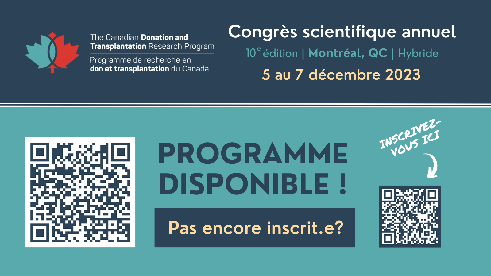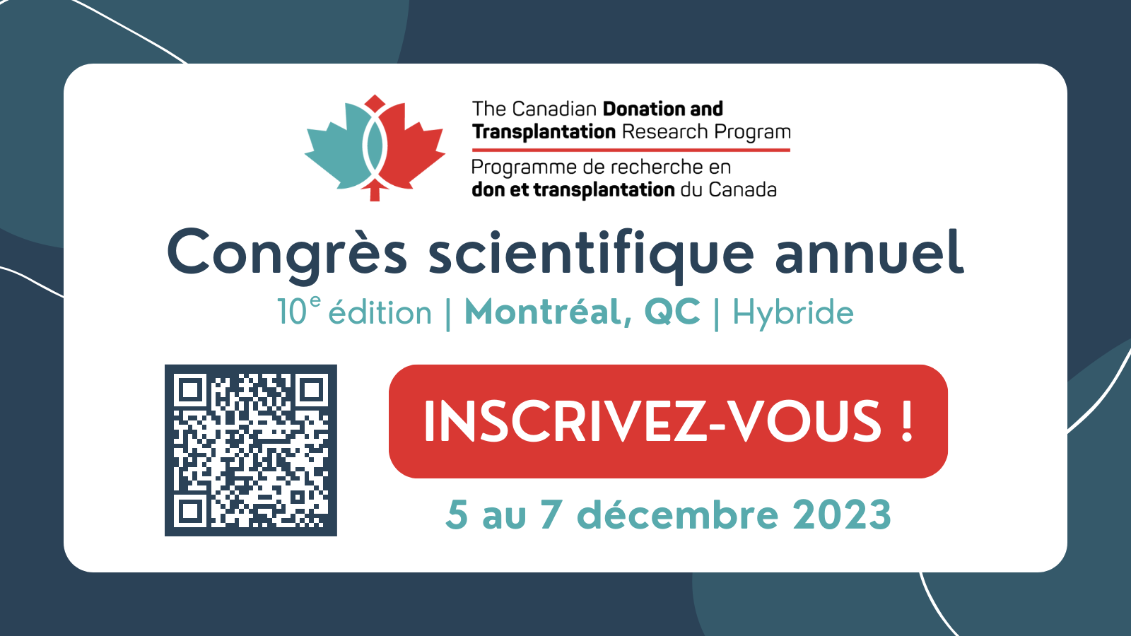 Rejoignez-nous à Montréal ou depuis la maison du 5 au 7 décembre 2023, et joignez-vous à notre dynamique communauté de recherche en don et transplantation. Ensemble, ouvrons la voie à un avenir rempli de percées transformatrices. Nous avons hâte de vous accueillir au 10e Congrès scientifique annuel du PRDTC !