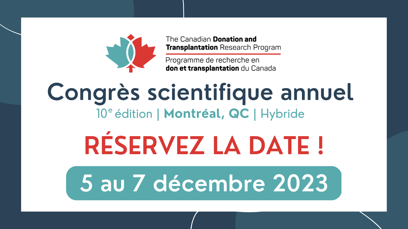 Notre très attendu Congrès scientifique annuel approche à grands pas, et nous espérons vous y voir. L’événement se déroulera dans un format hybride, avec un volet en personne à Montréal, QC, du 5 au 7 décembre 2023. Nous sommes ravis d’annoncer que les coprésidentes de la réunion de cette année sont Dr. Siba Haykal et Dr. Vanessa Silva e Silva, soutenues par un comité de planification composé de chercheurs, de stagiaires ainsi que de patient, famille et donneur partenaires du PRDTC.