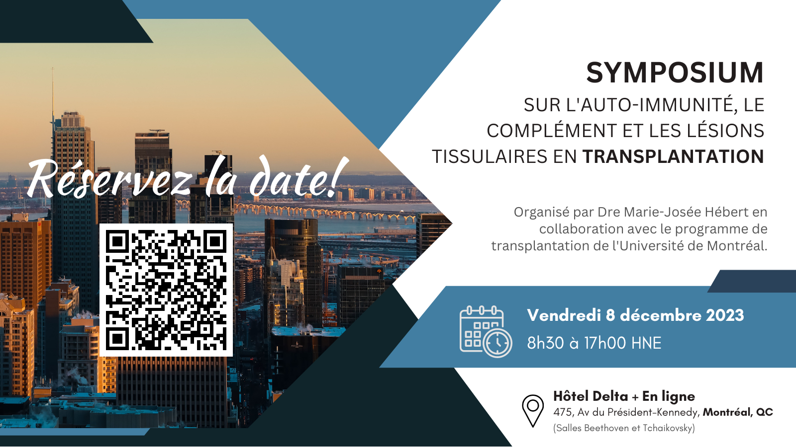 L’équipe de la Dre Marie-Josée Hébert en collaboration avec le programme de transplantation de l’Université de Montréal, est heureux d’organiser un Symposium sur l’auto-immunité, le complément et les lésions tissulaires en transplantation dans un format hybride, avec la composante en personne à Montréal, QC, le 8 décembre 2023 à l’hôtel Delta.