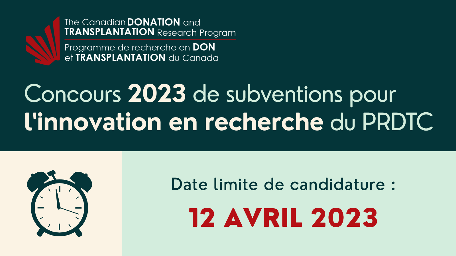 Attention à tous les chercheurs et innovateurs ! La date limite pour le Concours de subventions pour l’innovation en recherche du PRDTC est le 12 avril 2023. Ne manquez pas cette occasion de faire une différence dans le domaine de la recherche en don et transplantation. Mettez de l’avant vos meilleures idées et soumettez votre proposition avant la date limite. Ne tardez pas trop à envoyer votre demande !