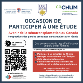 L’objectif de cette étude est de recueillir les perspectives sur l’avenir de la xénotransplantation au Canada parmi ceux et celles qui sont concernés par la transplantation rénale en tant que personne en attente de ou ayant reçu une greffe, personne ayant donné un rein, proche aidant ou professionnel. Les résultats de l’étude déboucheront [...]