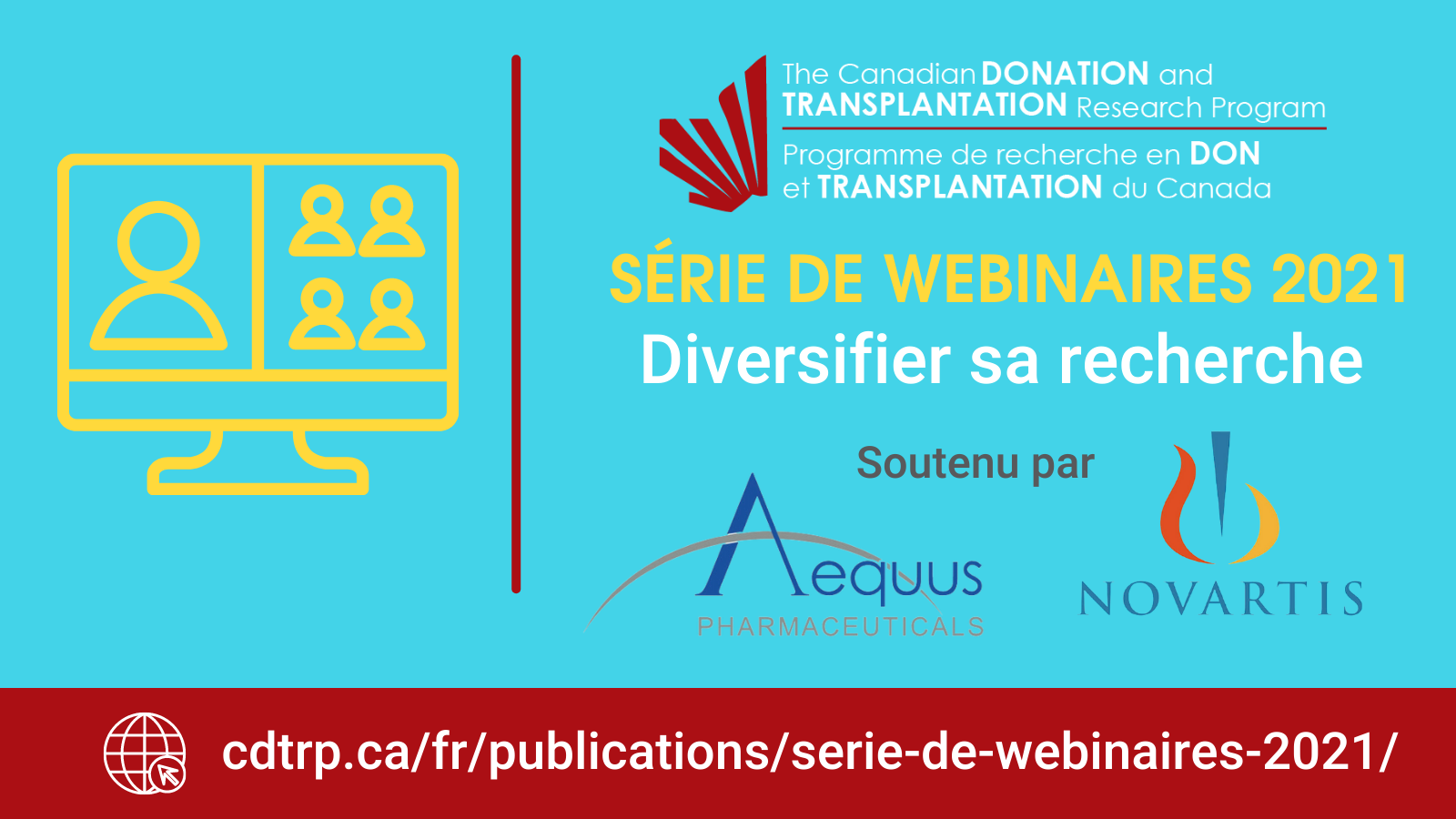 Merci à tous les conférencières et conférenciers ainsi qu’aux participants pour la série de webinaires 2021 du PRDTC, ayant pour thème « Diversifier sa recherche. » Nous tenons à remercier tout particulièrement Aequus Pharmaceuticals et Novartis Pharmaceuticals pour leur soutien à cette série.