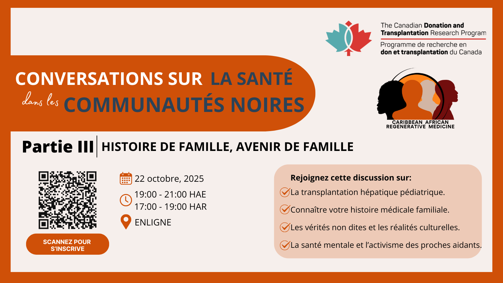 Le Programme de recherche en don et de transplantation (PRDTC) et le Projet Caribbean African Regenerative Medicine (CARM) sont fiers de présenter une nouvelle série de webinaires axée sur la santé et le bien-être des communautés africaines, caribéennes et noires (ACB).