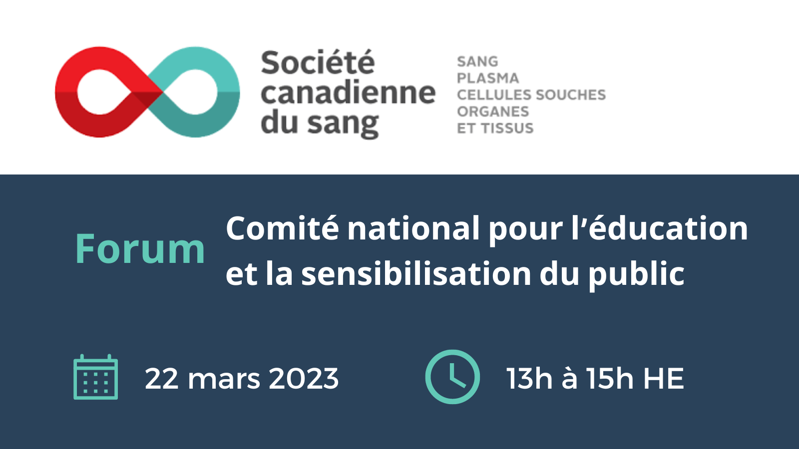 Les inscriptions sont ouvertes pour une présentation spéciale lors du prochain forum du Comité national pour l’éducation et la sensibilisation du public, organisé par la Société canadienne du sang (SCS).