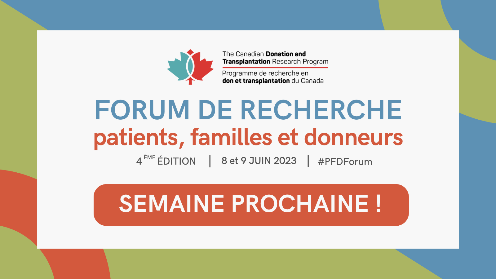 La 4e édition du Forum de recherche des patients, familles et donneurs du PRDTC aura lieu LA SEMAINE PROCHAINE, les 8 et 9 juin ! Cet événement virtuel de deux jours est une occasion unique pour les chercheurs et les patients de se réunir et de discuter des derniers développements en matière de recherche sur la transplantation centrée sur le patient. Le forum est divisé en quatre blocs qui se concentrent sur l’intégration des patients, des familles et des donneurs dans les différentes étapes de la recherche, la mobilisation des connaissances et la définition des priorités de recherche.