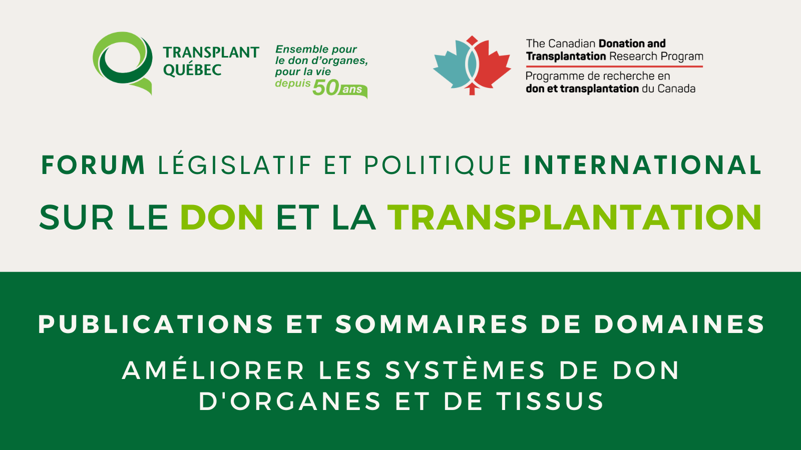 Afin d’identifier et de relever les défis communs en matière de don d’organes et de tissus, Transplant Québec et le Programme de recherche en don et transplantation du Canada ont organisé conjointement le Forum législatif et politique international sur le don et la transplantation. Le forum a élaboré 94 recommandations consensuelles d’experts, fondées sur des données probantes, dans le but d’améliorer les lois et les politiques relatives au don et à la transplantation d’organes et de tissus. Ces recommandations peuvent être adaptées pour être utilisées dans les systèmes de don et de transplantation au Canada et dans le monde entier. Vous pouvez accéder aux publications du Forum dans Transplantation Direct ci-dessous et télécharger tous les sommaires de Domaines.
